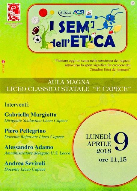 L’US Lecce è stata inserita dalla Lega Pro, assieme ad altre 10 società, nel progetto educativo “I Semi dell’Etica”, finalizzato a smuovere le coscienze nei confronti della corretta convivenza e a sensibilizzare la cultura etica a partire proprio dalle scuole e dallo sport.