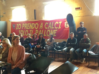 Si è svolto questa mattina, presso le Officine Cantelmo, l’incontro – dibattito in occasione della Giornata mondiale contro la violenza sulle donne, organizzato dall’Assessorato alle Politiche di Genere del Comune di Lecce, da un’idea dell’Associazione Diamo Voce e Volto agli Invisibili Onlus. L’obiettivo dell’incontro è quello di comunicare al territorio le risorse messe in campo da enti e associazioni e offrire alle donne vittime di violenza il sostegno della rete territoriale e la speranza di costruire insieme nuove opportunità. All’incontro ha partecipato una delegazione della società giallorossa, con il responsabile dell’area tecnica Stefano Trinchera e i calciatori Romeo Papini e Giuseppe De Feudis. Nella sala che ha ospitato il dibattito è stato esposto uno striscione, con la scritta “IO PRENDO A CALCI SOLO IL PALLONE”, che verrà esposto al Via del Mare nella gara con il Messina.